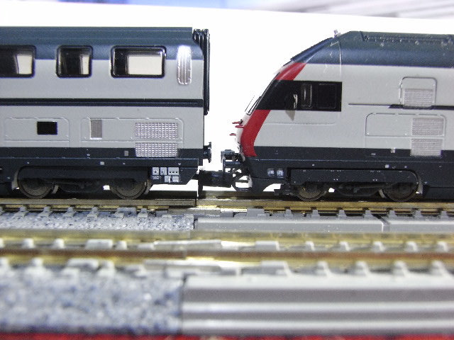 そこで、車高を少し上げることにします。右の制御客車(Bt)には集電板が入っている関係で、他の車両より0.5mm程度車高が上がっています。ので、これを基準に調整していきます。