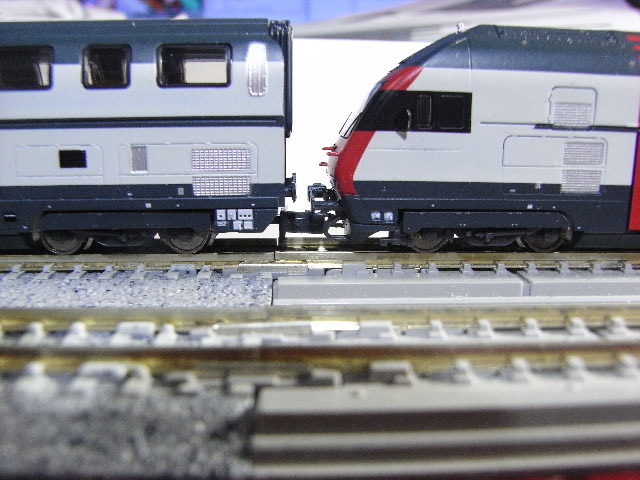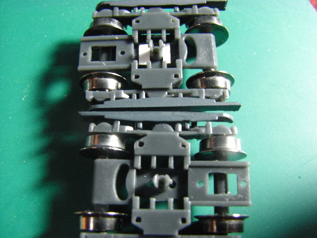 組み立てると、左のA車の高さが上がっています。1枚目と見比べると、台車カバーと車体に少しスキマが出来ていると思います。